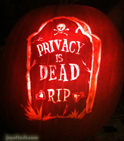 What could be more scary than a 26-year old billionaire who controls the private information of 500 million people, and thinks privacy is dead? Nothing, in our humble opinion! Here are links to the pattern you can use to make your own Zuck o' Lantern. Just click on the image below, download the linked file, print it out on your printer and away you go. We've also included a bonus "Privacy is Dead" tombstone pattern! You can follow the simple directions on our comic, or head on over to a more detailed tutorial here. It features our classic Ellen Feiss pumpkin, but the same principles will apply to the Zuck o' Lantern. Note: The Zuck o' Lantern is for serious, dedicated pumpkin carvers, it is a real challenge! We also have a Steve Jobs Pattern that is a little easier, if you so desire.