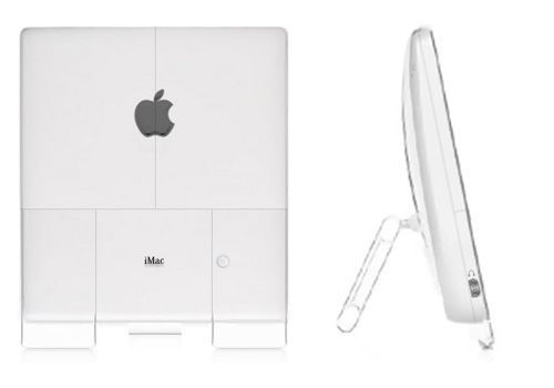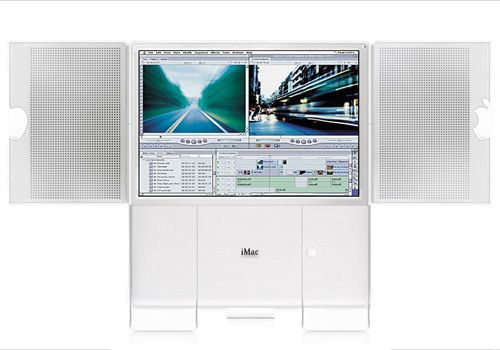 The doors contain speakers, the Apple logo is clear so that an iTunes-like display can show through with the doors closed, the CD drive is a similar style to the 20th Anniversary Mac, the ports are on the side edges of the case.