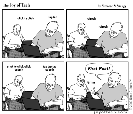 Welcome to the Joy of Tech... our new daily comic, illustrated by Nitrozac and written by Nitrozac and Snaggy. It's a little bit simpler in style than After Y2K, and will be more topical, and we hope you'll enjoy it!