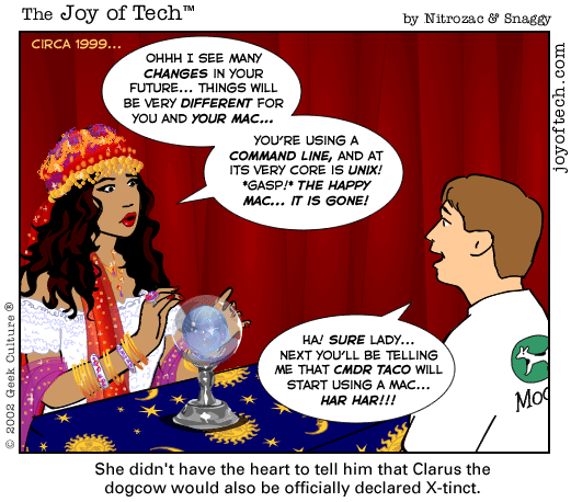 If you're using a Mac and a newer version of Explorer, here's a neat trick courtesy of MacMerc. Drag the above little image to the top tool bar of your browser, it should "stick" afterwards. Now you have a graphical link to the Joy of Tech, one that will update everytime a new comic is uploaded. (You may have to refresh the image manually if it's in your cache.) If you need to delete or move it it, just control button/click and hold, then select delete, or just Command/drag it to the trash.